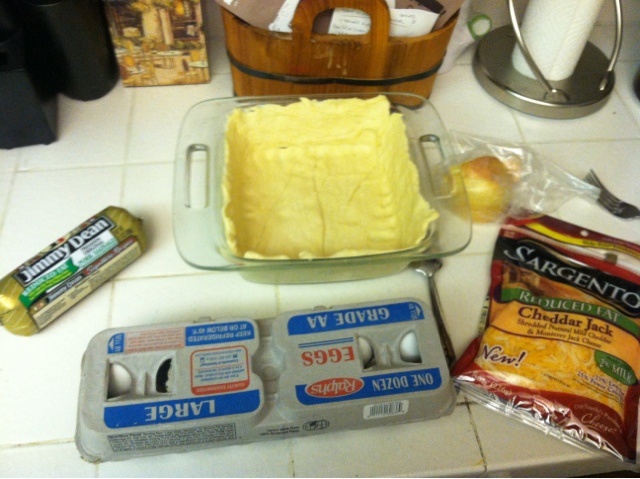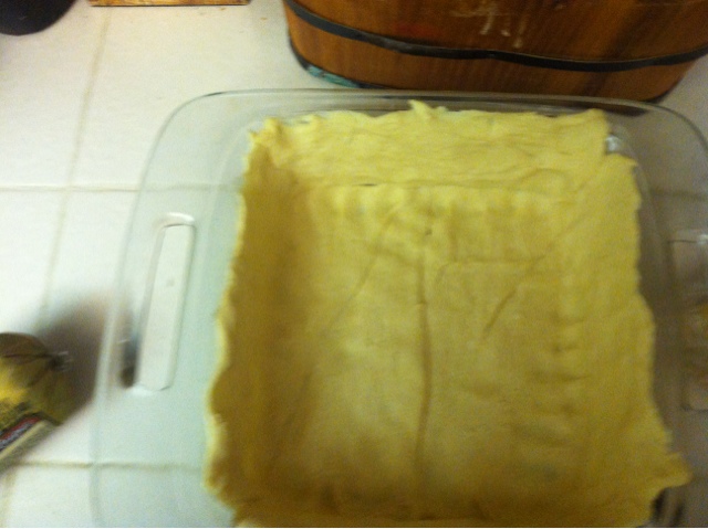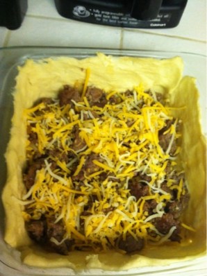 1. Spread out the crescent rolls so that they cover the whole glass baking dish, you may have to tear some off and patch up some spots. Oh, go ahead and preheat the oven to 350 degrees while you’re at it.