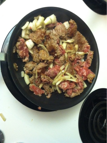 2. Cook up the breakfast meat of choice and the onions. The smell will be mildly intoxicating!