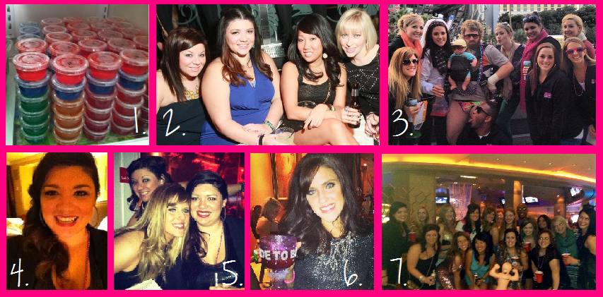 | And then Vegas happened… 1) This is what 152 Jell-o shots look like in your fridge. 2) Some of my favorite girls, at The Bank. We’re so money! 3. We found Alan and baby Carlos on the strip after our scavenger hunt. 4) Another shameless selfie. 5) Partying with Lil ‘John at Surrender. 6) The beautiful bride to be! 7) The whole gang. |